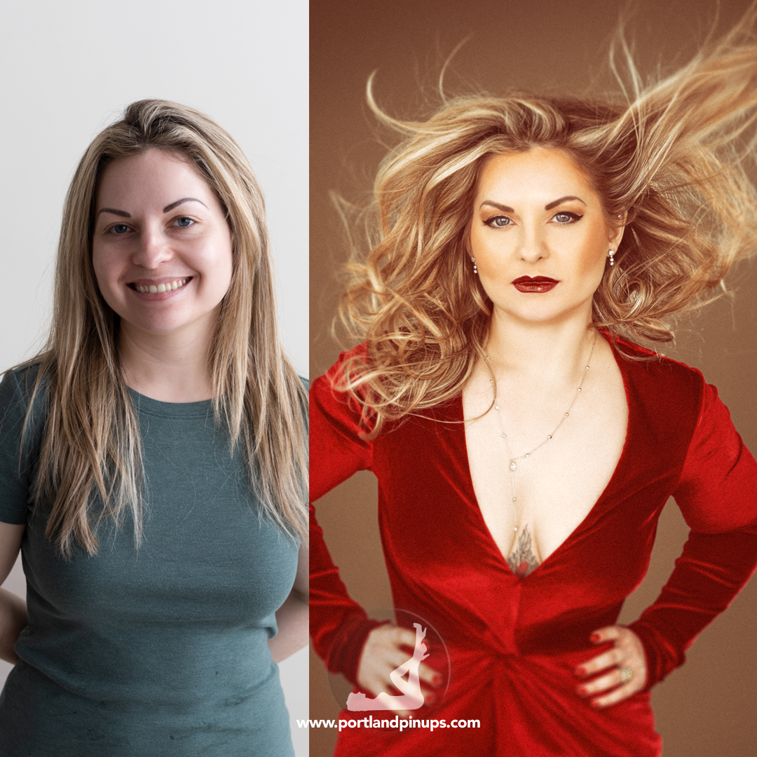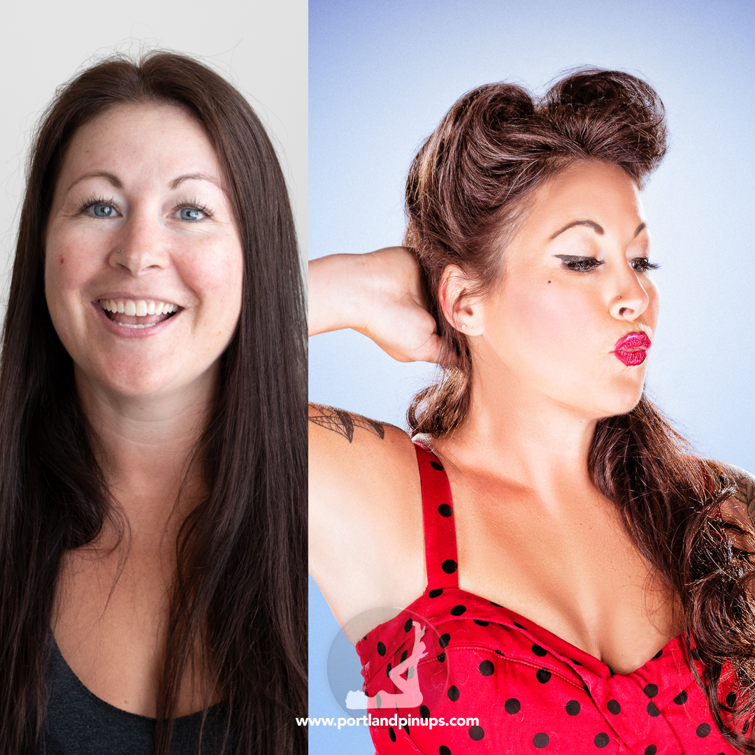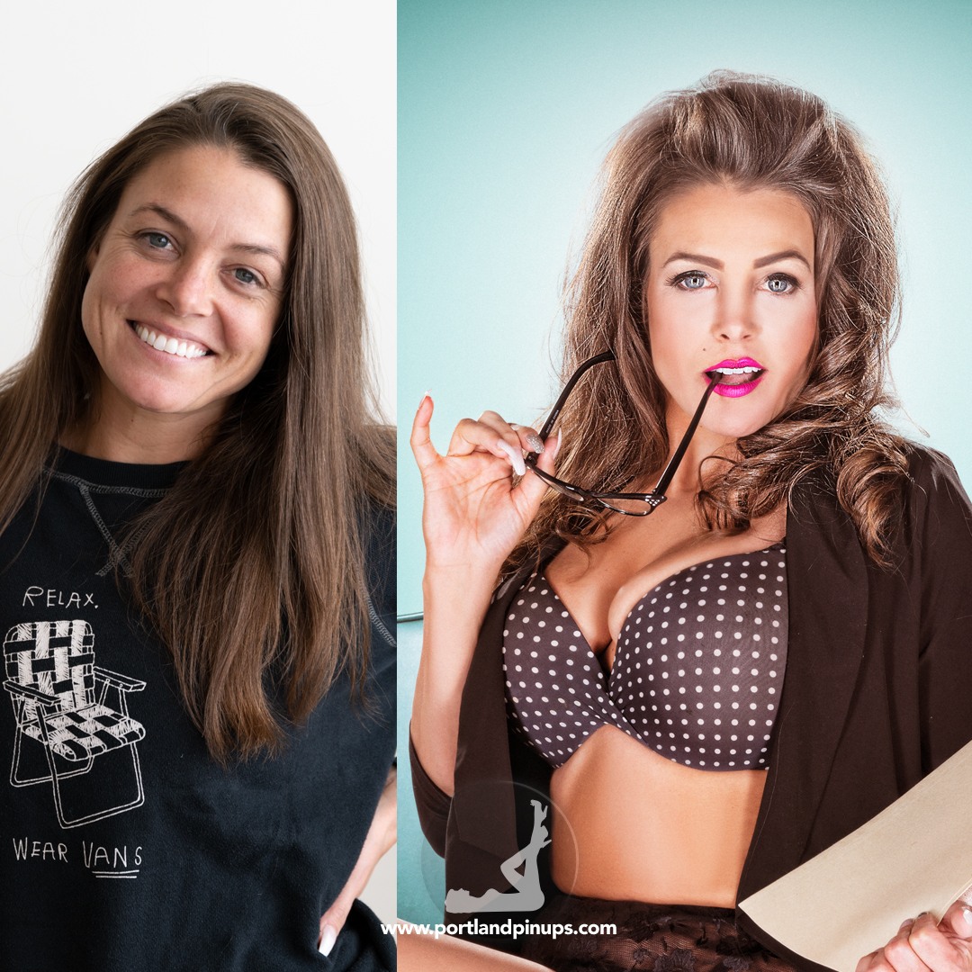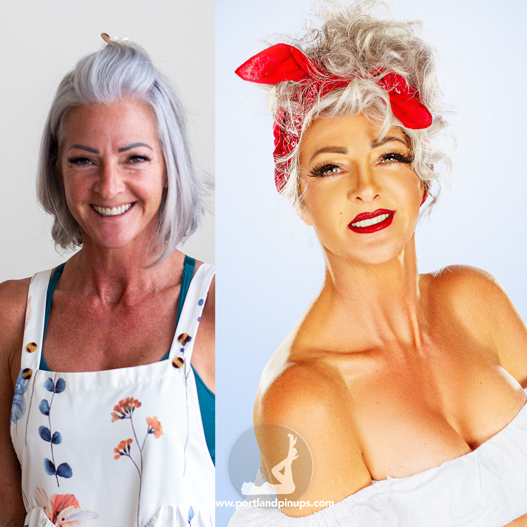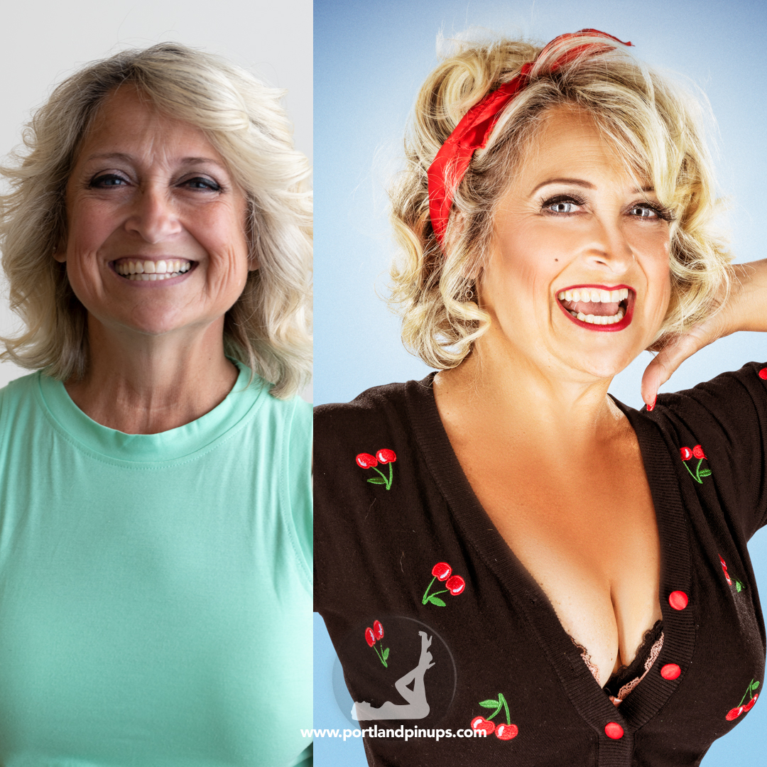 These side-by-side examples showcase everyday women (professionals, moms, trailblazers just like you) transformed into classic pin-up superstars—relaxed, radiant, and empowered.