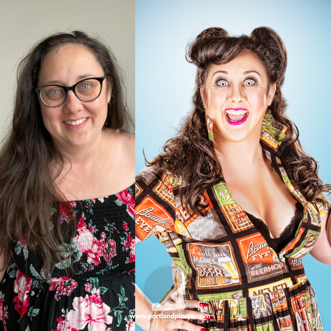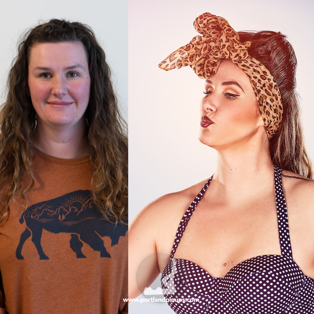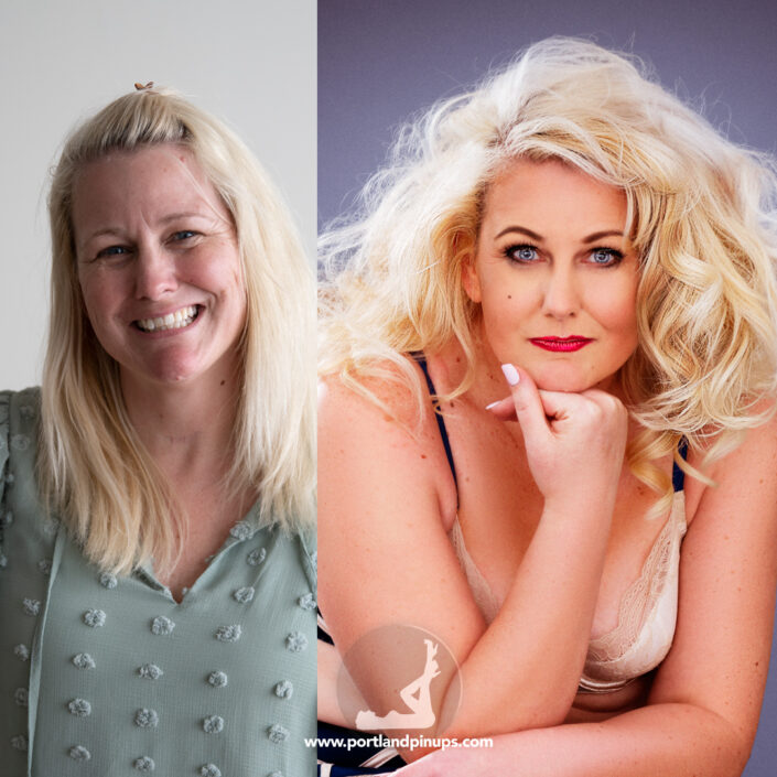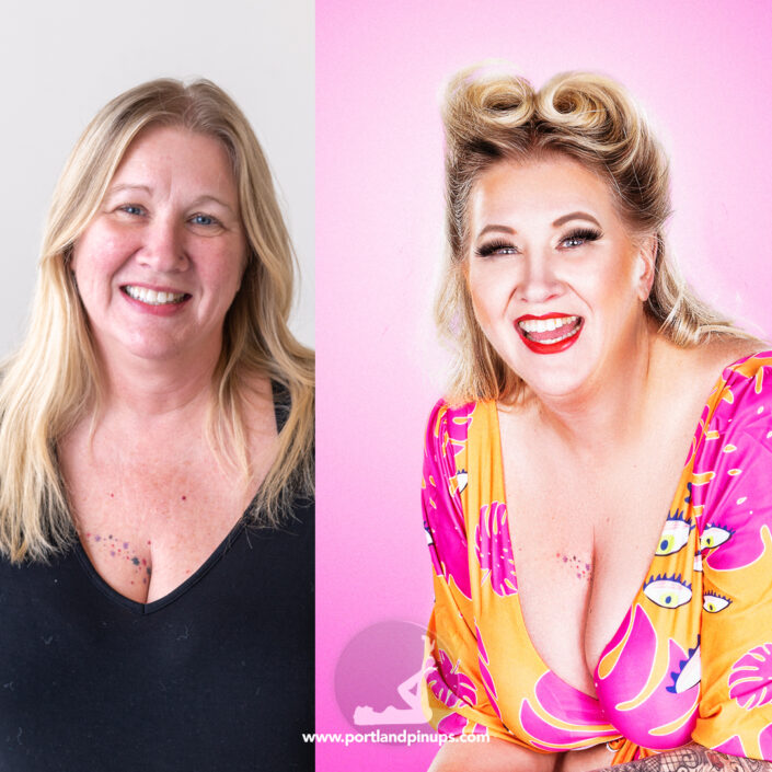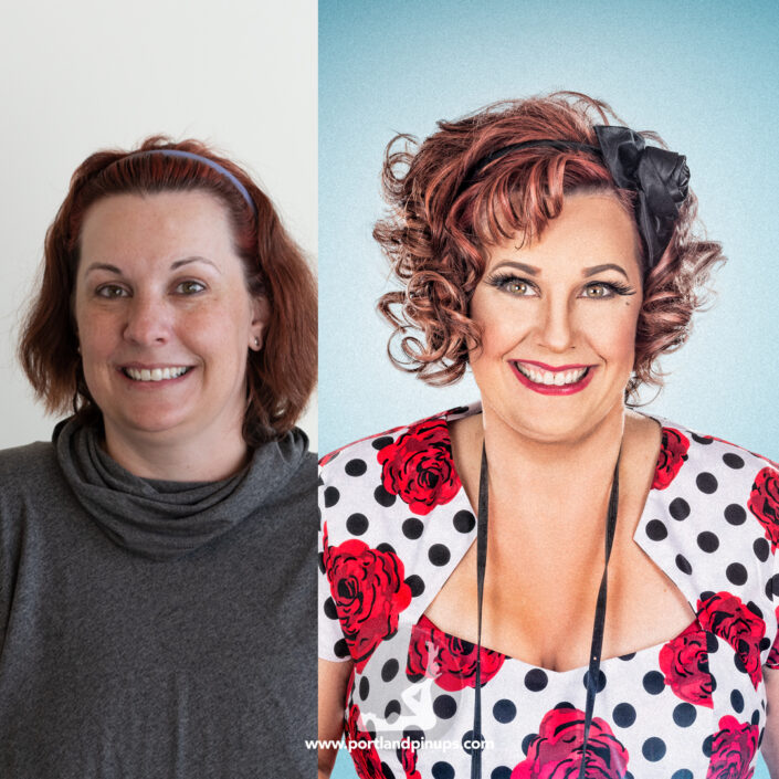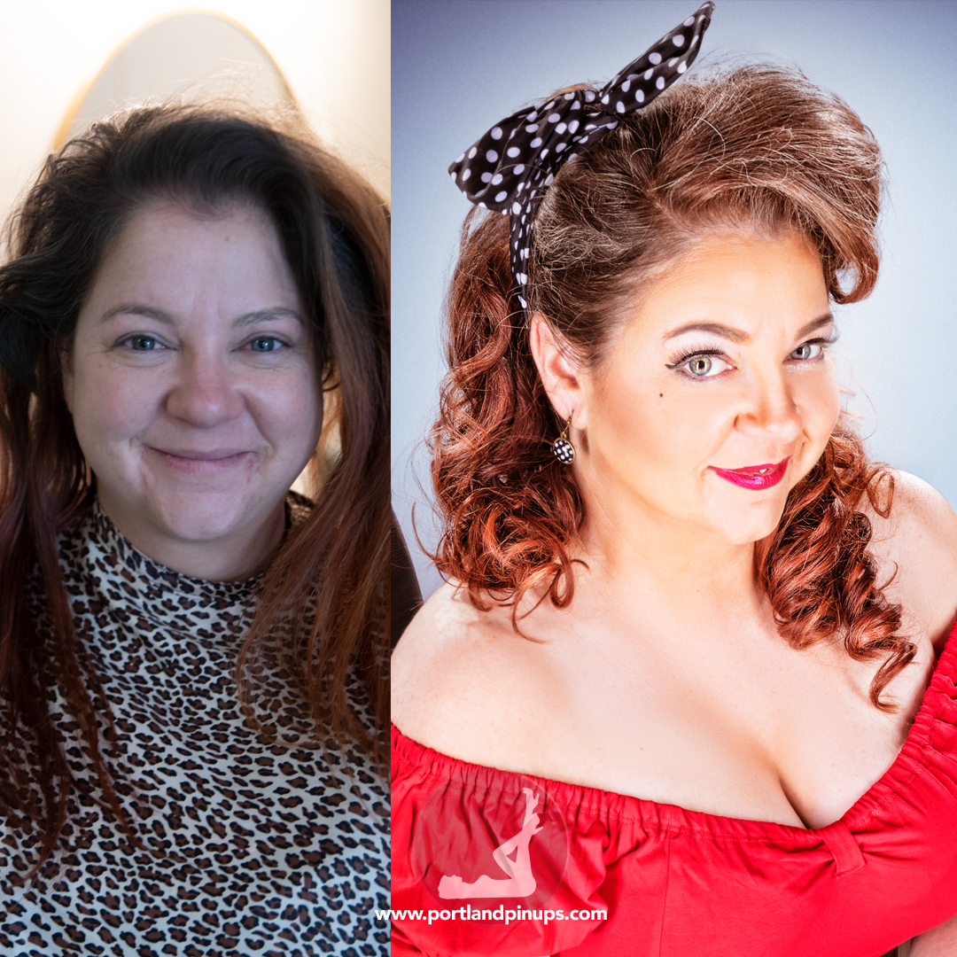 These side-by-side examples showcase everyday women (professionals, moms, trailblazers just like you) transformed into classic pin-up superstars—relaxed, radiant, and empowered.