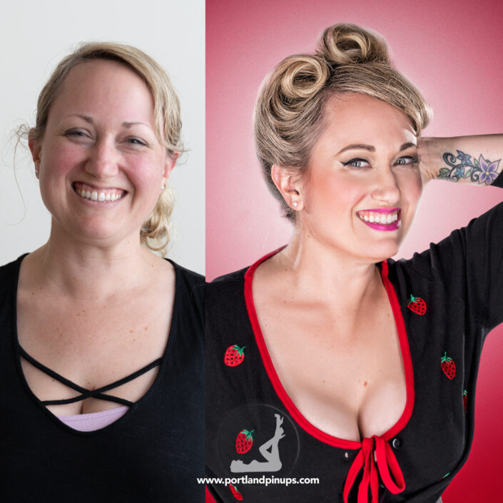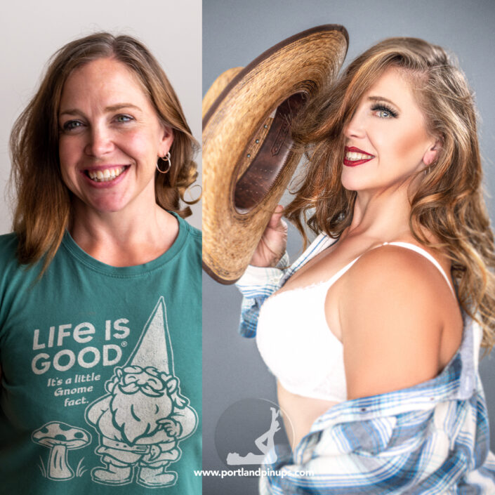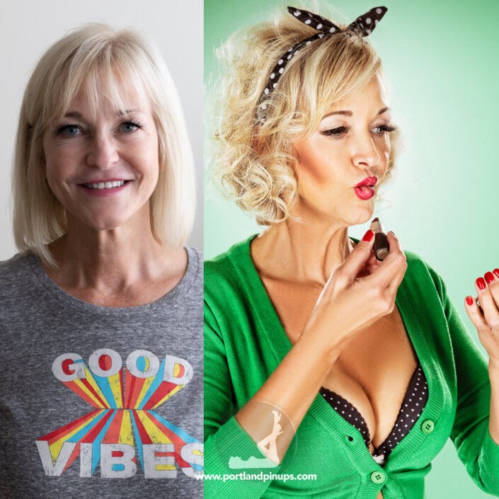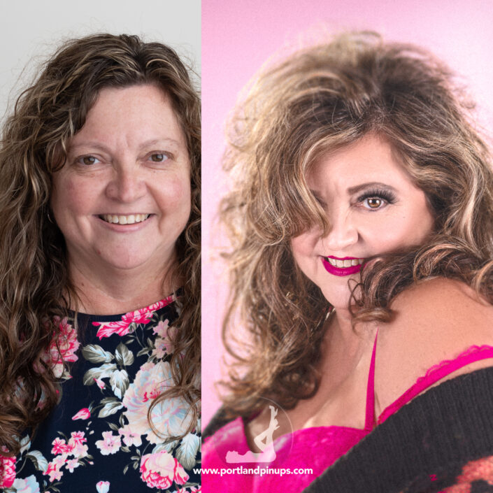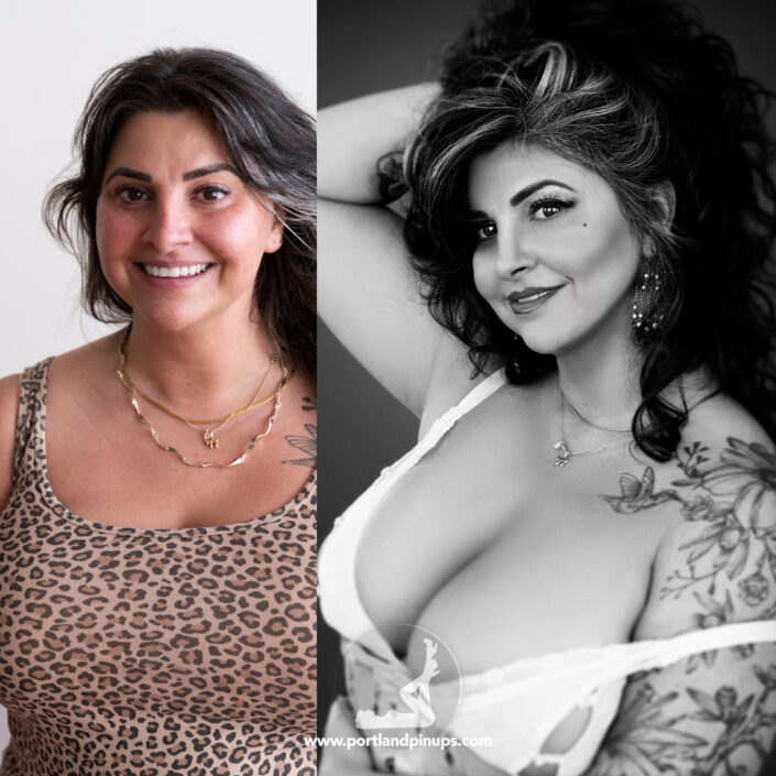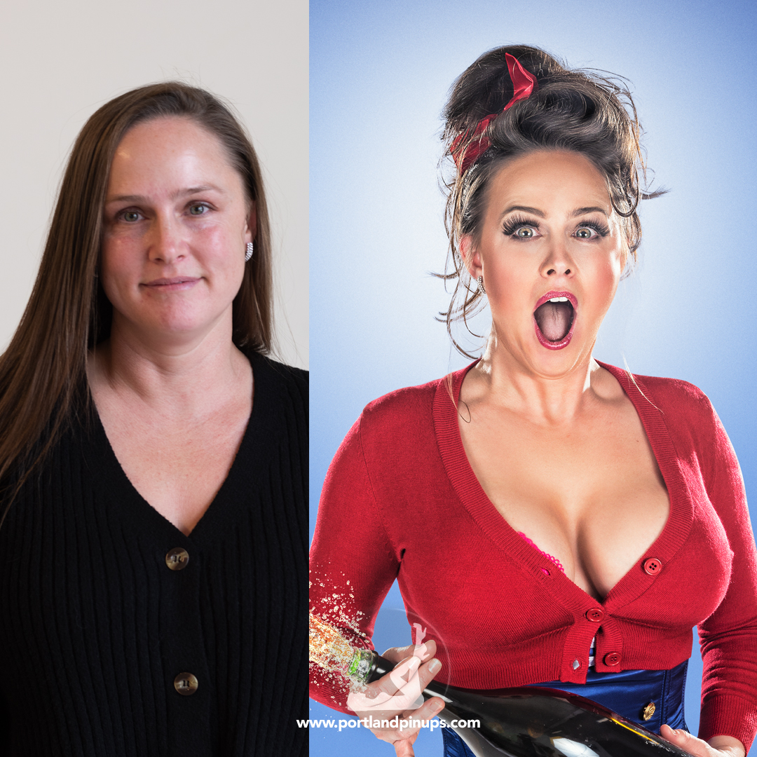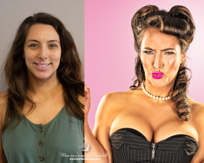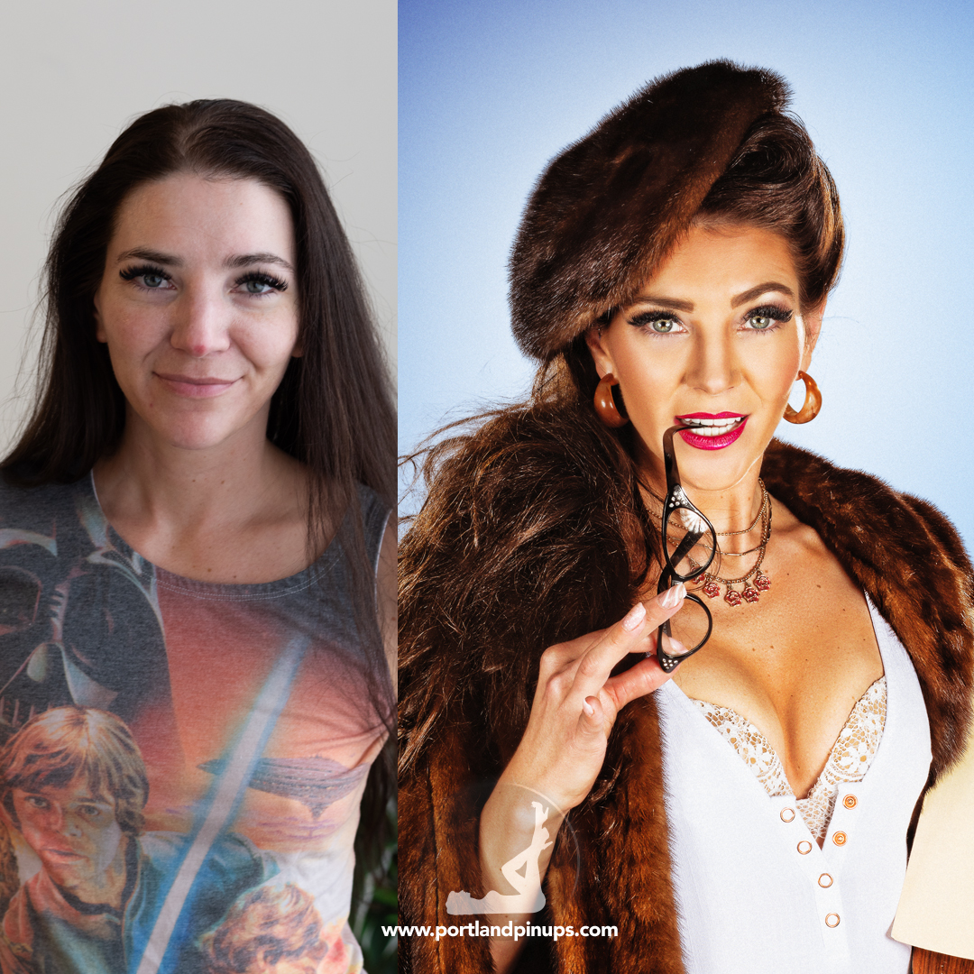 These side-by-side examples showcase everyday women (professionals, moms, trailblazers just like you) transformed into classic pin-up superstars—relaxed, radiant, and empowered.