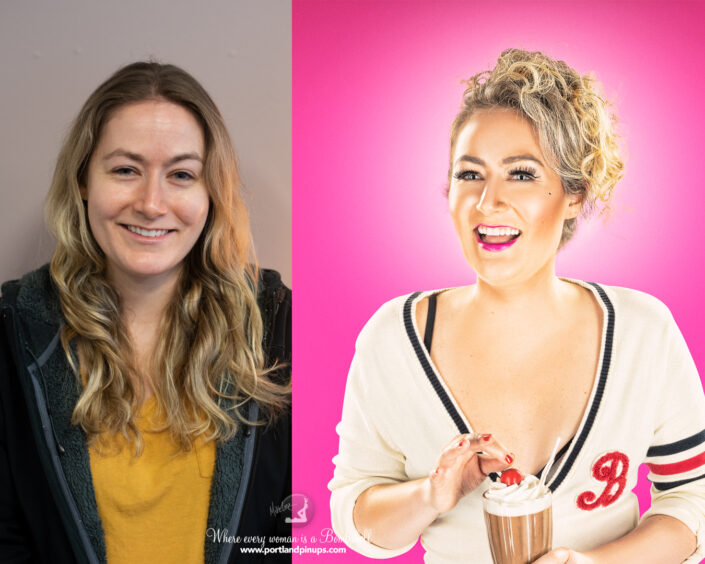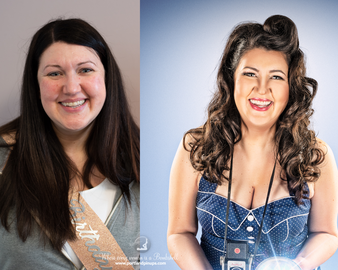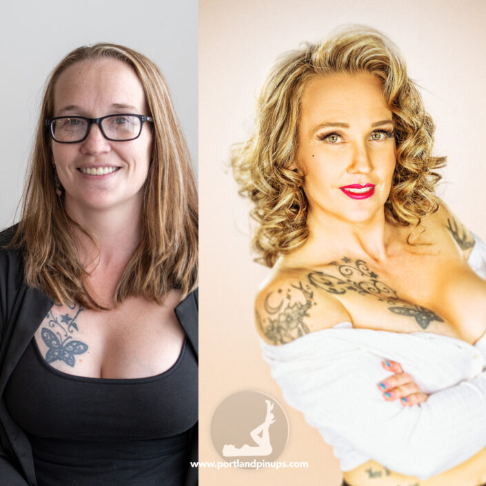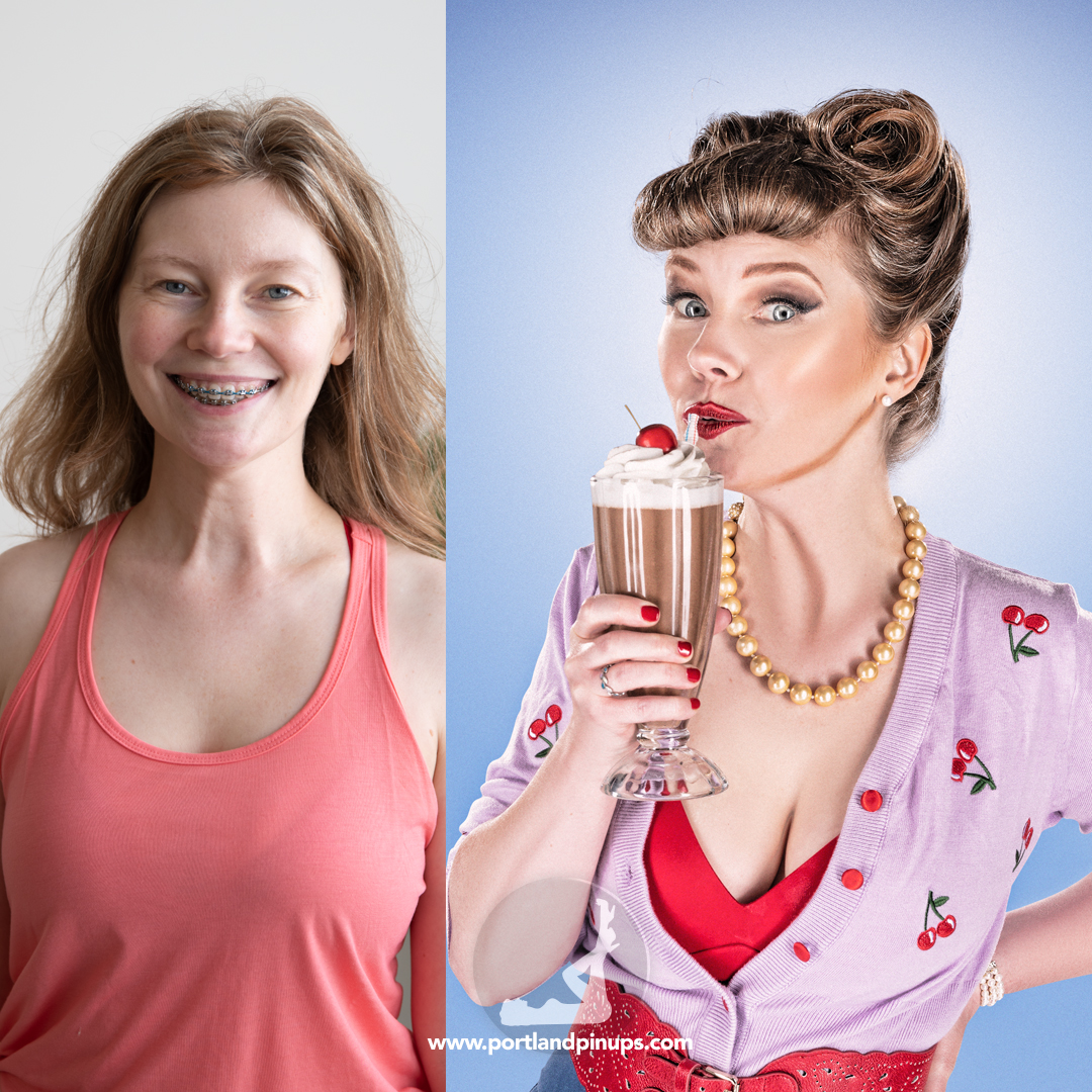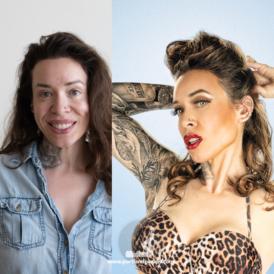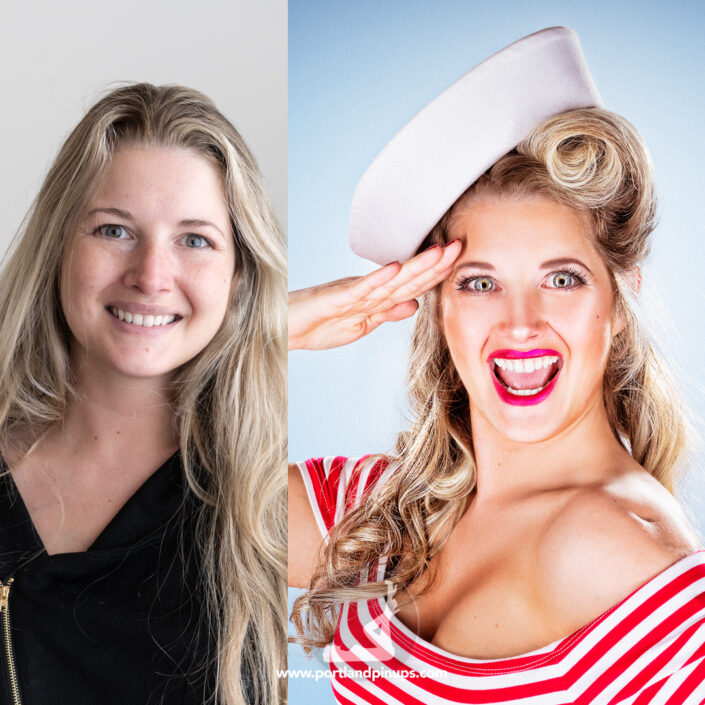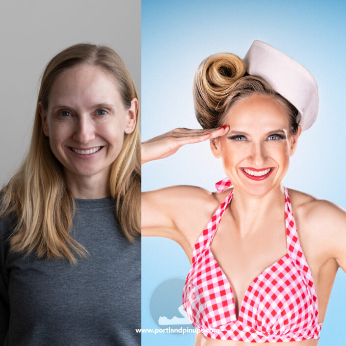 These side-by-side examples showcase everyday women (professionals, moms, trailblazers just like you) transformed into classic pin-up superstars—relaxed, radiant, and empowered.