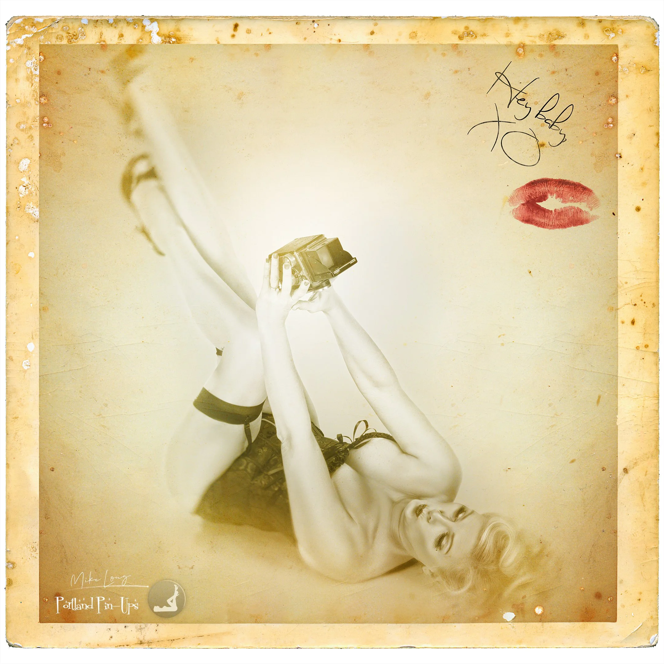 Vintage-style photo of a person in lingerie holding a camera with legs raised, featuring a lipstick kiss mark and 'Hey baby XO' text. View fullsize