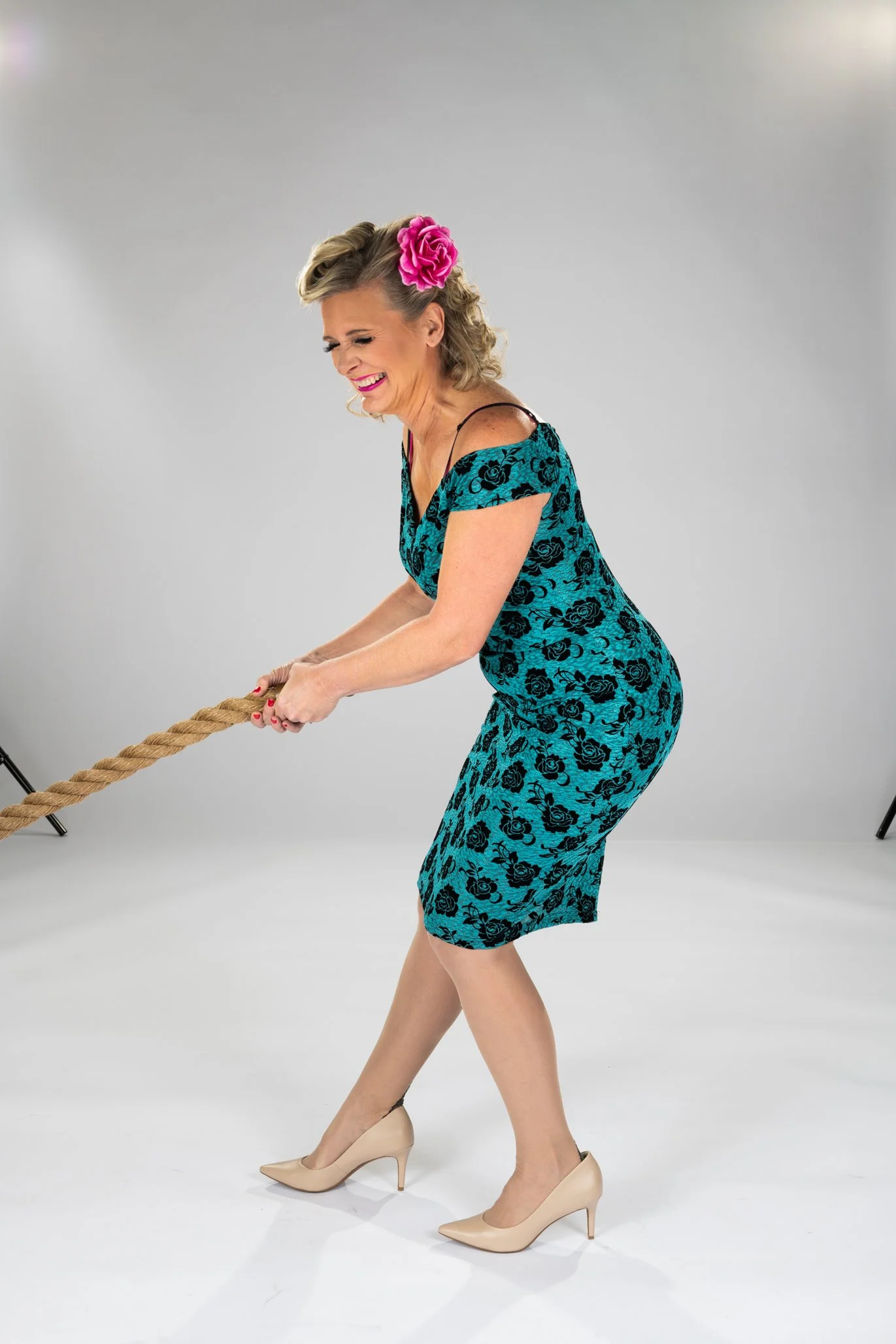 Woman in floral dress with a pink hair flower, pulling a rope, standing in a studio.